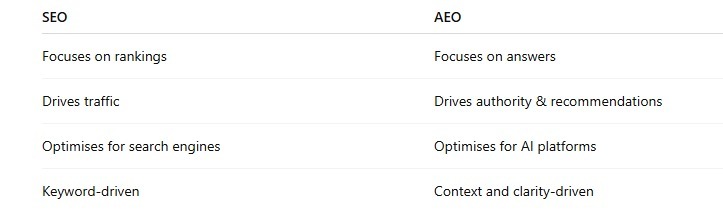 SEO can still drive traffic, but without AEO, your brand may miss visibility in AI-driven search and recommendations.